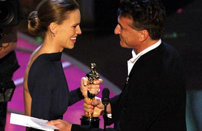 H Sean Penn, νικητής πέρσι στην κατηγορία Πρώτου Ανδρικού ρόλου, παραδίδει ως είθισται το φετινό Oscar Πρώτου Γυναικείου ρόλου στην Hilary Swank.