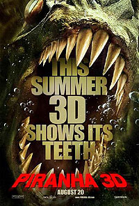 | Piranha 3D Σκηνοθεσία: Alexandre Aja Η έκρηξη ενός ηφαιστείου θα απελευθερώσει ορδές αιμοδιψών πιράνχας που δεν βλέπουν την ώρα να μασουλήσουν τους χιλιάδες τουρίστες που κατέφτασαν στη λίμνη Havasu για τον εορτασμό της επετείου της Αμερικανικής Ανεξαρτησίας. Remake της ομώνυμης ταινίας του Joe Dante, ο οποίος επρόκειτο να κάνει μια μικρή εμφάνιση στο φιλμ, αλλά οι ανάγκες των γυρισμάτων της νέας του ταινίας «The Hole» (μια τρισδιάστατη παιδική ταινία τρόμου) δεν του το επέτρεψαν.