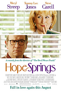 | Hope Springs + TrailerΣκηνοθεσία: David Frankel Μετά από 30 χρόνια γάμου η Kay και ο Arnold έχουν δει τη σχέση τους να ξεφτίζει μέρα με τη μέρα. Όμως η Kay είναι αποφασισμένη να ξαναζωντανέψει την χαμένη φλόγα καταφεύγοντας σε ένα φημισμένο σεξολόγο που δέχεται ζευγάρια στην πόλη Great Hope Springs. Καπάτσα όπως είναι καταφέρνει να πείσει το σύζυγό της και έτσι ξεκινά μια εβδομάδα έντονης συζυγικής και σεξουαλικής θεραπείας. Αραγε θα καταφέρουν οι δύο τους να αναζωογονήσουν τη σχέση τους και να μάθουν νέες... στάσεις; Πρώτη συνεργασία για Meryl Streep και Tommy Lee Jones σε μια ρομαντική κομεντί που στοχεύει σε μεγαλύτερο ηλικιακά κοινό. Στο ρόλο του σκηνοθέτη ο έμπειρος στο είδος David Frankel που είχε συναντήσει την Streep στο «The Devil Wears Prada»